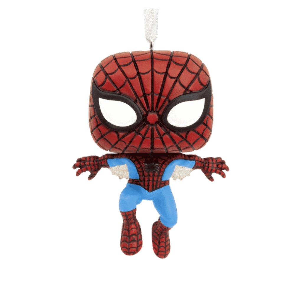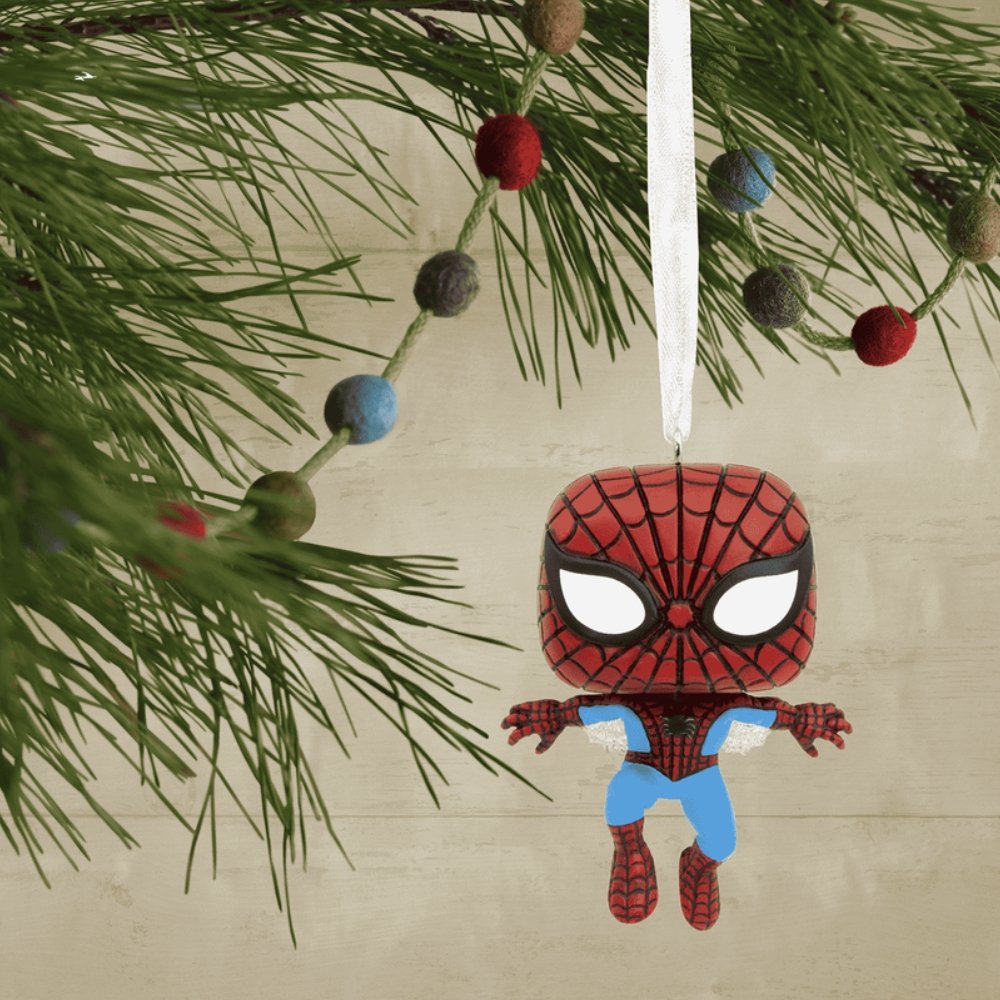 Dale un toque de la cultura pop a tu decoración navideña con un adorno Funko de Spider Man (hombre araña).